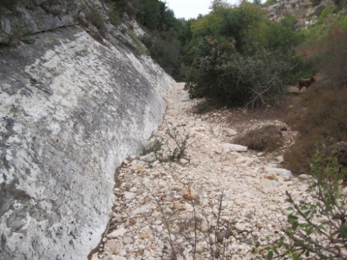 After some climbing down ledges you will be in the forest at the bottom of the wadi, walking on flat slabs of water eroded rock. After about an hour and a half from the start of the hike you will reach the intersection of the green trail with the blue trail. Take the blue trail going down and to your right (northwest).