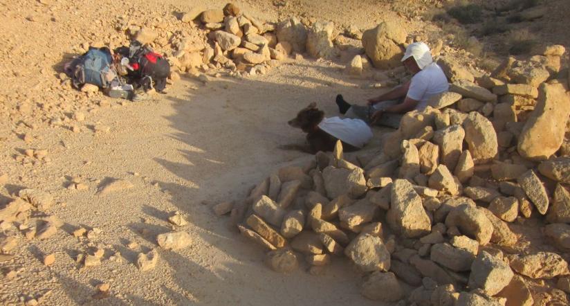 Now we needed to find a good place to camp. The area where we were was right on the junction of two dirt roads and the Israel Trail. It was too exposed to be a comfortable camping place. However, we didn’t want to hike too far with so much water to carry. I told Don to stay with the water and Taffy while I went in search of a good place. I walked further on the Israel Trail and there was soon a small wadi that went up towards the north. I clambered up a few meters and found a perfect place where someone, probably years ago, had cleared a flat area of rocks and used them to make low walls.