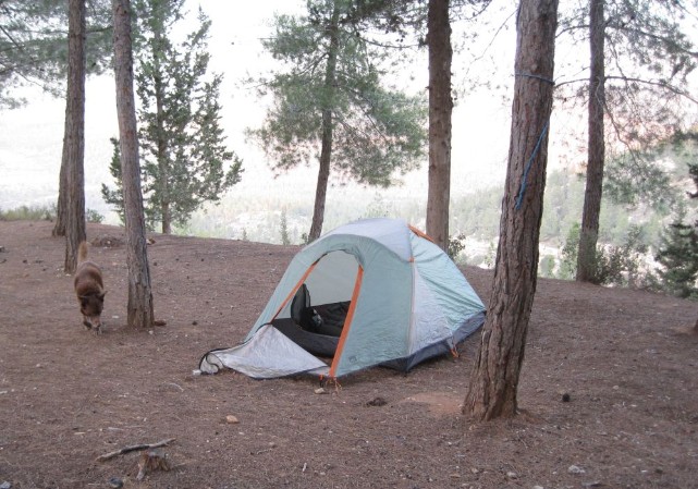 We arrived at our perfect camp site at around 4:30 with the sun gone, darkness approaching, and the temperature dropping sharply. We quickly set up our tent, arranged all our stuff, and put on all our layers. Then we gathered some of the ample dead wood from the area and built a fire to keep us warm while the darkness became complete. There were no human lights to be seen and the only sound was the chorus of Jackals in the back ground. Don and I chatted quietly while Taffy lay curled up near by. Soon Don made our usual dinner.
